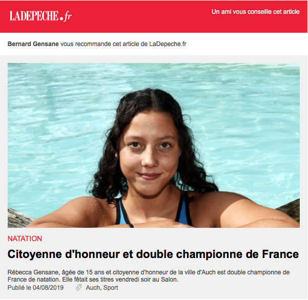 Rébecca Gensane savoure à Auch, la ville où elle est citoyenne d'honneur après un baptême républicain à ses un an, un repos bien mérité. Elle vient de remporter, à force de sérieux et d'entraînement, un titre de double championne de France de natation, dans la catégorie Espoir, soit les moins de 15 ans. Elle avait remporté plus tôt dans l'année le titre de championne de France junior en mars. Un joli triplé.