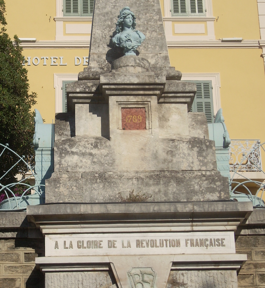 Bizarrement, juste en face de l’Hôtel de ville, se dresse un monument « à la gloire de la Révolution française ». Vous avez bien lu : ce monument n’est pas dédié « à la République française », mais à la Révolution, sans laquelle, on le sait bien, il n’y aurait pas eu de République.
