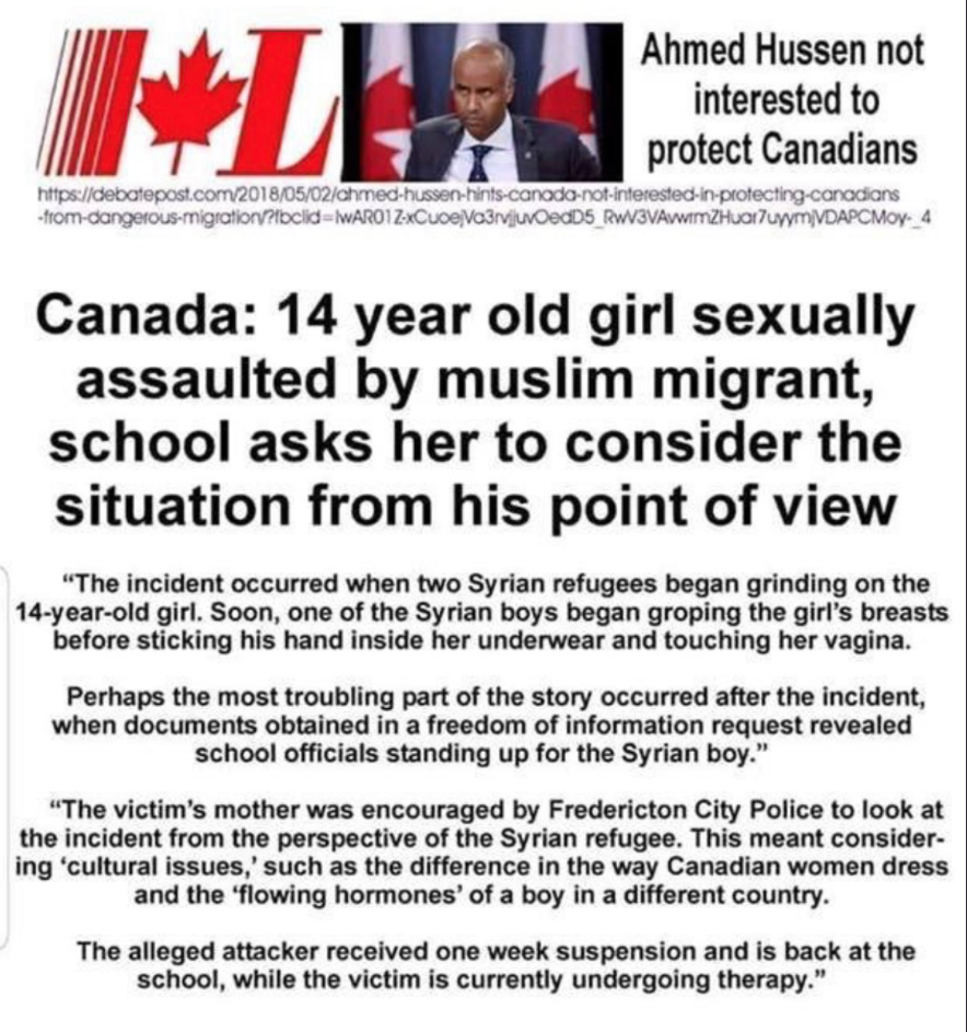 Hé bien dans le Canada hyper politiquement correct de l'inconscient Trudeau, c’est fait. Et par des adultes, et le plus sérieusement du monde. Une petite de 14 ans a été abusée par un Syrien – un migrant, une espèce particulièrement protégée au Canada – qui a commencé par la draguer lourdement en compagnie d’un (ou deux selon les sources) de ses compatriotes. Puis il lui a caressé les seins, a glissé sa main dans sa culotte et lui a touché le vagin.